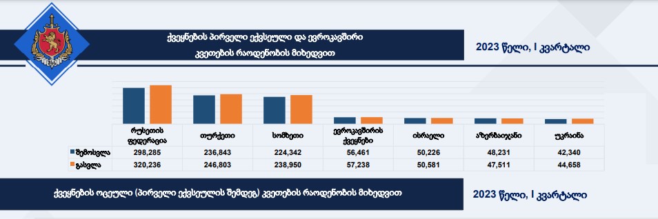 შინაგან საქმეთა სამინისტროს 2023 წლის პირველი კვარტალის სტატისტიკის მიხედვით, საქართველოში ყველაზე მეტი მოქალაქე რუსეთის ფედერაციიდან შემოვიდა.