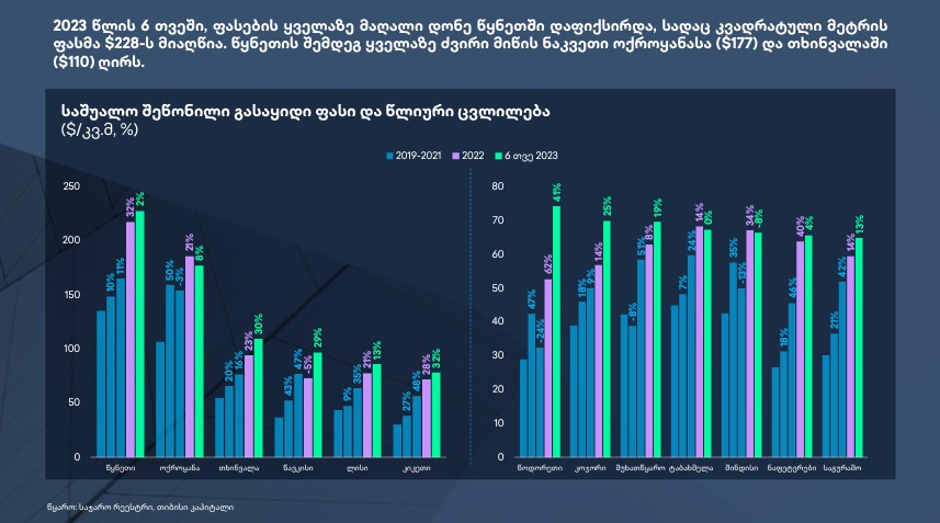 ამასთან, კვლევის თანახმად, 2023 წლის 6 თვეში, ფასების ყველაზე მაღალი დონე წყნეთში დაფიქსირდა, სადაც კვადრატული მეტრის ფასმა 228 აშშ დოლარს მიაღწია. წყნეთის შემდეგ ყველაზე ძვირი მიწის ნაკვეთი ოქროყანასა ($177) და თხინვალაში ($110) ღირს.