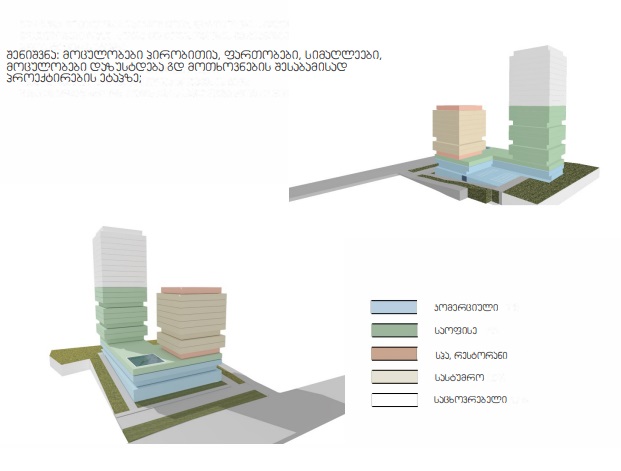 ამასთან, როგორც დოკუმენტშია აღნიშნული, მოცულობები, ფართობები და სიმაღლეები პროექტირების ეტაპზე დაზუსტდება. კომპლექსში იგეგმება, საცხოვრებელი ფართების, სასტუმროს, სპა, რესტორანის და კომერციული, საოფისე ფართების მოწყობა. იხილეთ სრულად