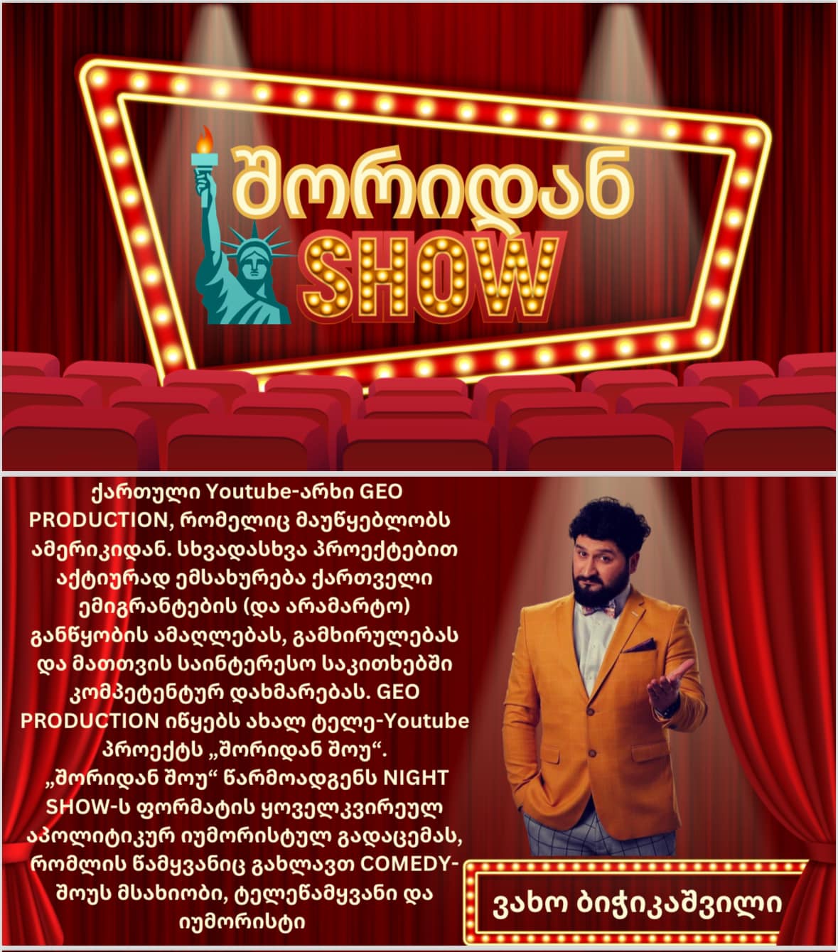 "ძალიან მალე პროექტი "შორიდან შოუ" ბრუნდება, ყველაზე მონატრებული მაყურებლისთვის, ბრუნდება უფრო ხმამაღალი ნათქვამია ვიდრე თავიდან იწყება, ჩავწერეთ ერთი გადაცემა მაგრამ მალევე გავჩერდით, ის არხი სამწუხაროდ გაჩერდა. ახლიდან ვიწყებთ ყველაფერს და თქვენი გვერდით დგომა გვჭირდება, გამოიწერეთ ამერიკაში შექმნილი პირველი ქართული შემეცნებით გასართობი GEOproduction -ის იუთუბ არხი, რომლის გვერდითაც დგას GA Logistics LLC Geo Amanati Elt Building თანმშრომლობას და მეგობრობას განვიხილავთ სხვა კომპანიებთან, როგორც საქართველოდან ისე ადგილობრივ ბიზნესებთან სურვილი თქვენია, ძალით არაფერი არ ვარგა.