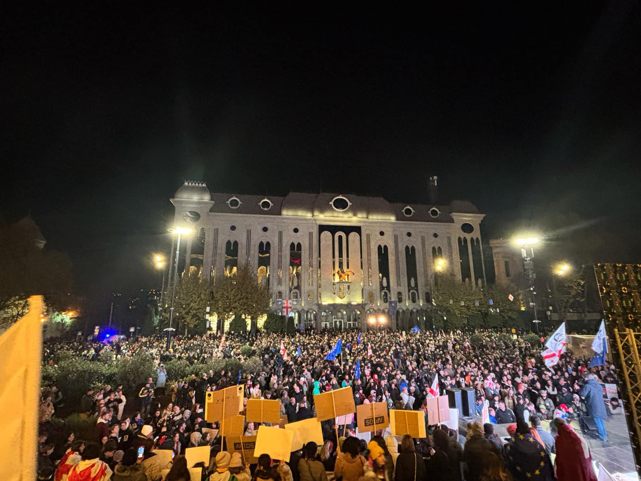 “ჩვენ აქ ვდგავართ და ჩვენ აქ [თსუ-სთან] ვრჩებით. 24 საათი, ეს აქცია იდგება აქ - ნელ-ნელა, მაგრამ მიზანმიმართულად, დაგეგმილად, მშვიდობიანად დავიკავებთ ჩვენს ქვეყანას“, - ასე მიმართა “კოალიცია ცვლილებებისთვის” ერთ-ერთმა ლიდერმა, ნიკა გვარამიამ რუსთაველის გამზირზე შეკრების საზოგადოებას.