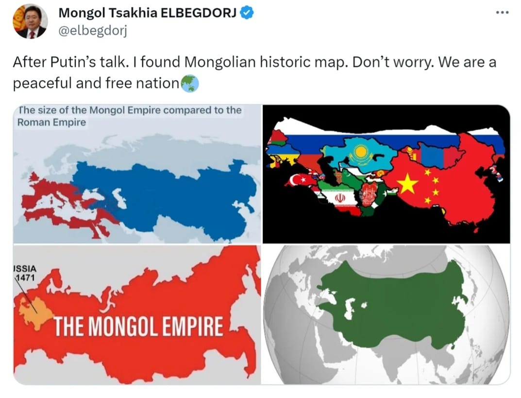 “მეგობრებო, მონღოლეთის ექსპრეზიდენტმა ცაჰიაგიინ ელბეგდორჯმა, მას შემდეგ, რაც ვლადიმი პუტინმა ამერიკელ ჟურნალისტ ტაკერ კარლსონს ინტერვიუ მისცა, სოციალურ ქსელში მონღოლეთის ისტორიული რუკები გამოაქვეყნა. და პოსტიც დაურთო: