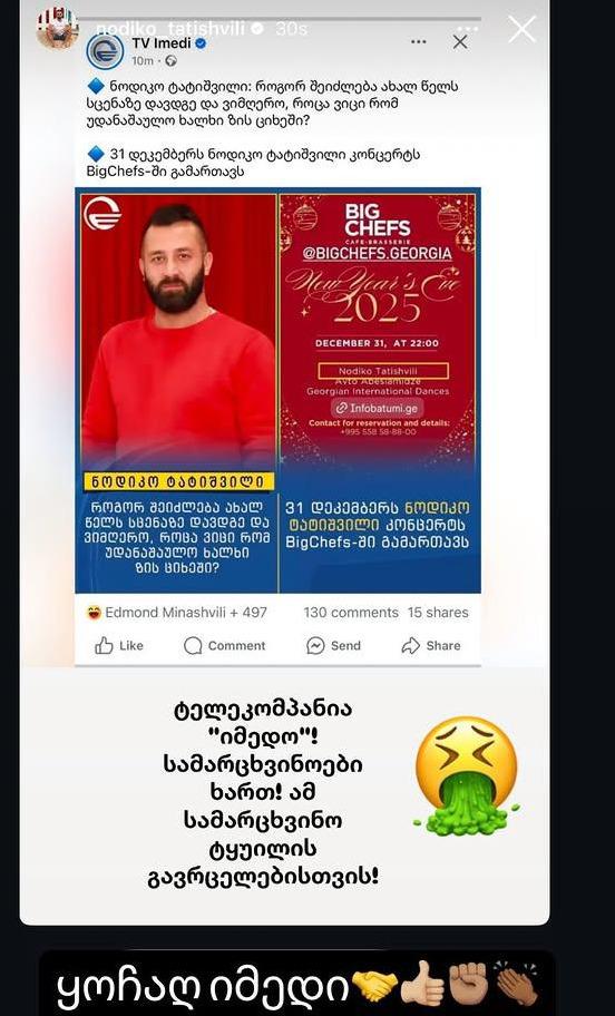 "როგორ შეიძლება ახალ წელს სცენაზე დავდგე და ვიმღერო, როცა ვიცი, რომ უდანაშაულო ხალხი ციხეში ზის" - ეს სიტყვები მომღერალმა ნოდიკო ტატიშვილმა „ტვ პირველის“ ეთერში განაცხადა. მეორე დღეს კი ტელეკომპანია "იმედმა" გაავრცელა ქარდი, სადაც წერდა, რომ 31 დეკემბრის ღამეს, ტატიშვილი რესტორან BEG CHEFS-ში იმღერებს.