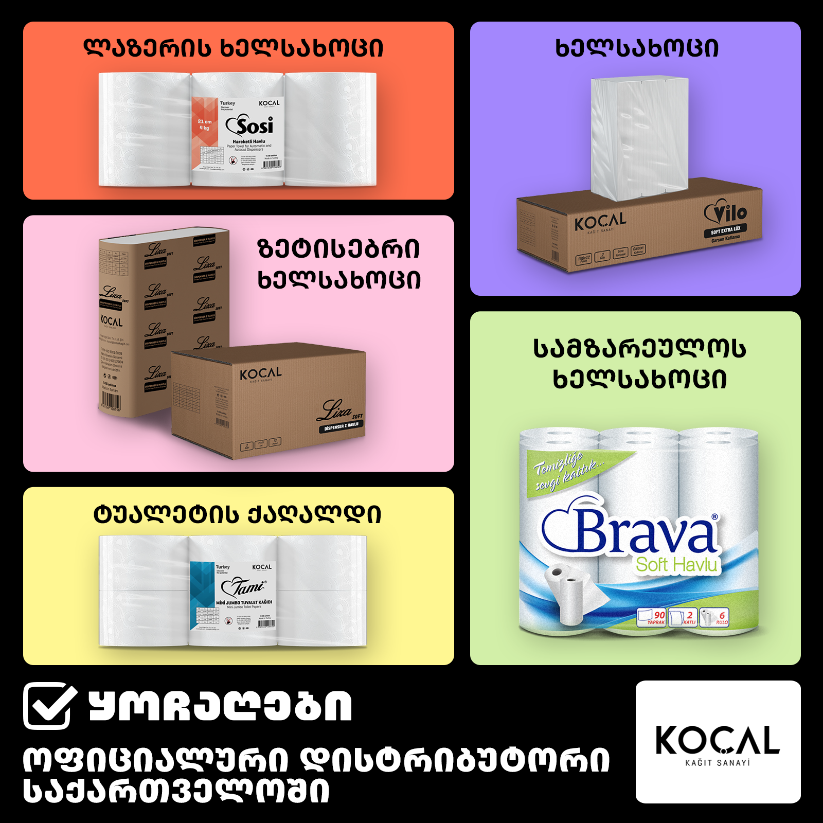 თურქული კომპანია Kocal სამზარეულოს, მაგიდის, ჰიგიენური ხელსახოცის, დისპენსერის თუ სხვა ინდუსტრიული ქაღალდის სექტორში პროდუქტებს 1995 წლიდან აწარმოებს. ქაღალდის საწარმო თურქეთში, საკარიას მე-2 ორგანიზებულ ინდუსტრიულ ზონაში მდებარეობს და თავისი საწყობებით სტამბოლსა და ანკარაში ფუნქციონირებს. კომპანიის წარმოების სიმძლავრე ყოველთვიურად 750 ტონას შეადგენს. ყოველდღიური მოხმარების, სხვადასხვა დანიშნულების, მაღალხარისხიანი ქაღალდი სუფთა და უსაფრთხო გარემოში იწარმოება, რასაც "ISO 9001“ ხარისხის მართვის სისტემის და TSE /TSEK ხარისხის სტანდარტების სერთიფიკატები ცხადყოფს.