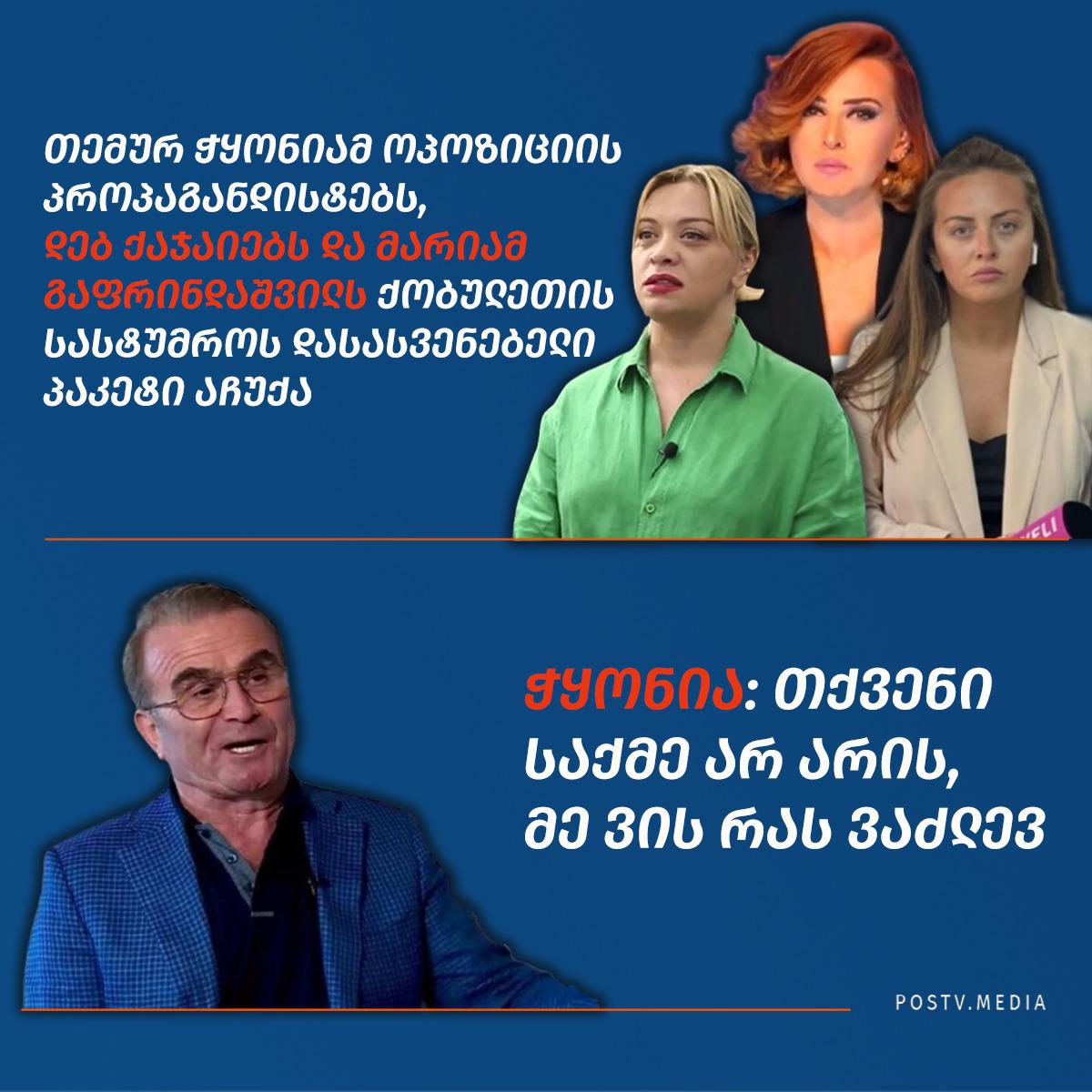 პირველ ქარდზე ვკითხულობთ, რომ "თემურ ჭყონია ოპოზიციის პროპაგანდისტებს - დებ ქაჯაიას და მარიამ გაფრინდაშვილს ქობულეთის სასტუმროს დასასვენებელი პაკეტი აჩუქა“. მოგვიანებით POSTV-მ მეორე ქარდიც გამოაქვეყნა, რომელშიც ჭყონიას კომენტარს ასახავენ: ბიზნესმენის თქმით, ჟურნალისტ ნატა და ნანუკა ქაჯაიებს, ასევე მარიამ გაფრინდაშვილს, ხელფასს „მეგობრულად უხდის“.